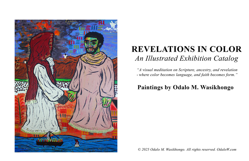 Revelations In Color is a powerful full-color exhibition catalog showcasing the visionary art of Odalo M. Wasikhongo, where faith, ancestry, history, and bold color converge as living revelation.